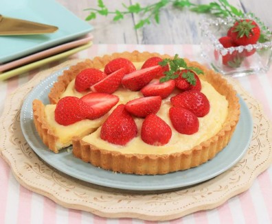 將130克無鹽牛油及1隻蛋黃回溫至室溫。牛油放入大碗,用膠刮拌至順滑,加入蛋黃拌勻。再加入麵粉,以切拌方式混合,至呈碎屑狀後,於碗邊壓成麵糰。 將麵糰搓成球,夾在保鮮紙中間,用麵棍壓成約4毫米厚、21厘米直徑圓片,鋪入撻模並貼緊邊位。製作迷你塔時可分割麵糰,平均壓入各模,厚度約3毫米。用叉於撻皮底部刺孔,蓋上保鮮紙,放入雪櫃冷藏至少1小時。焗爐預熱至180°C,移除保鮮紙,將塔皮放入焗爐焗20至25分鐘(迷你撻焗15至20分鐘),時間可按焗爐型號調整。焗好後放晾架散熱並脫模。填入吉士醬,鋪上新鮮士多啤梨及可選用意大利芫茜作裝飾。