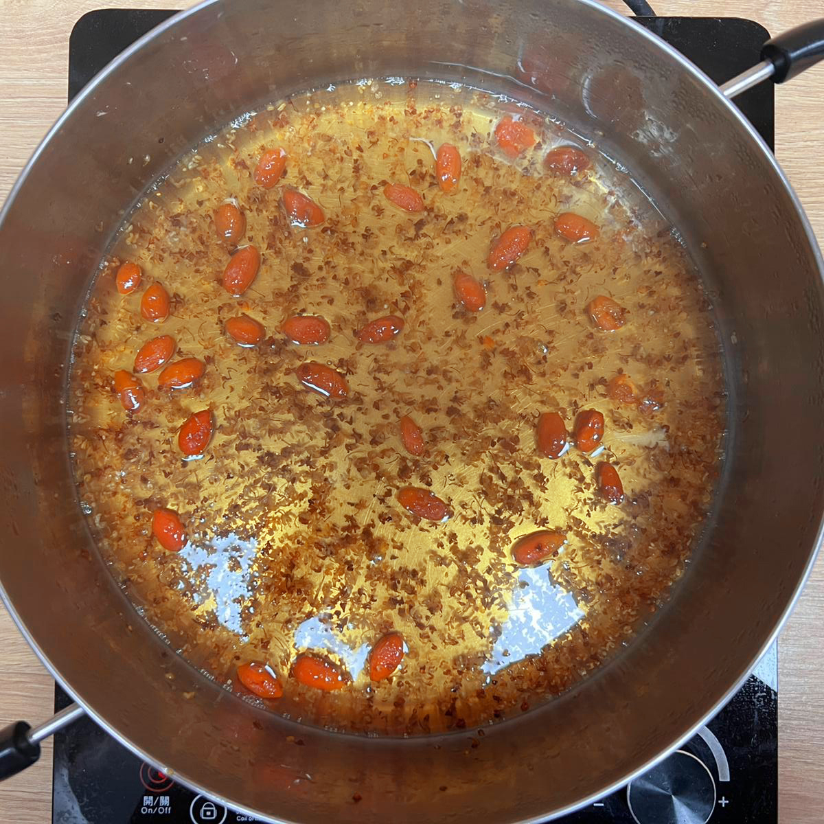 加入已泡發的桂花及杞子(連同浸泡水) 以慢火煮 8 分鐘,讓香氣充分釋出