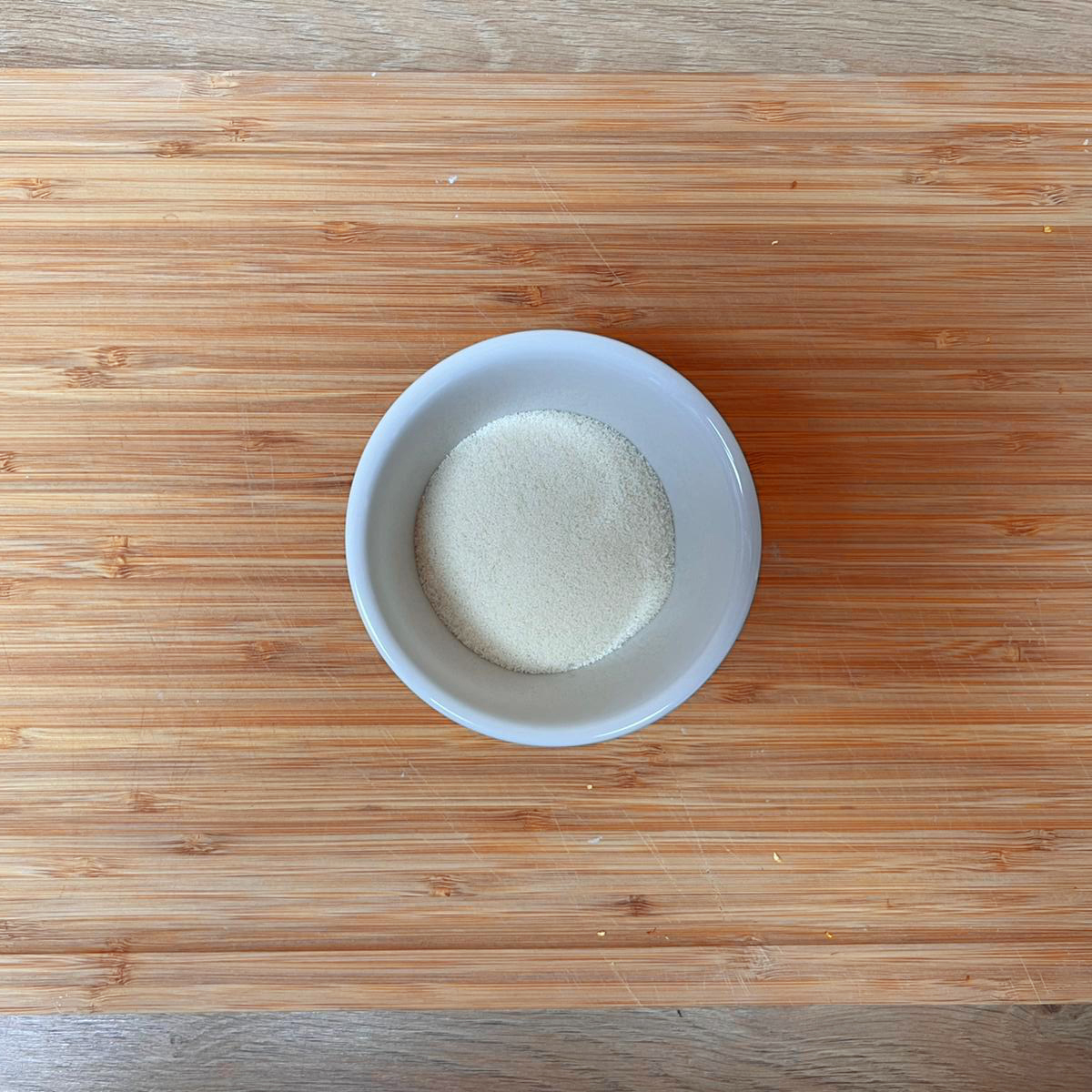 將魚膠粉 15g 慢慢加入,同時攪拌 確保完全溶解,避免結塊