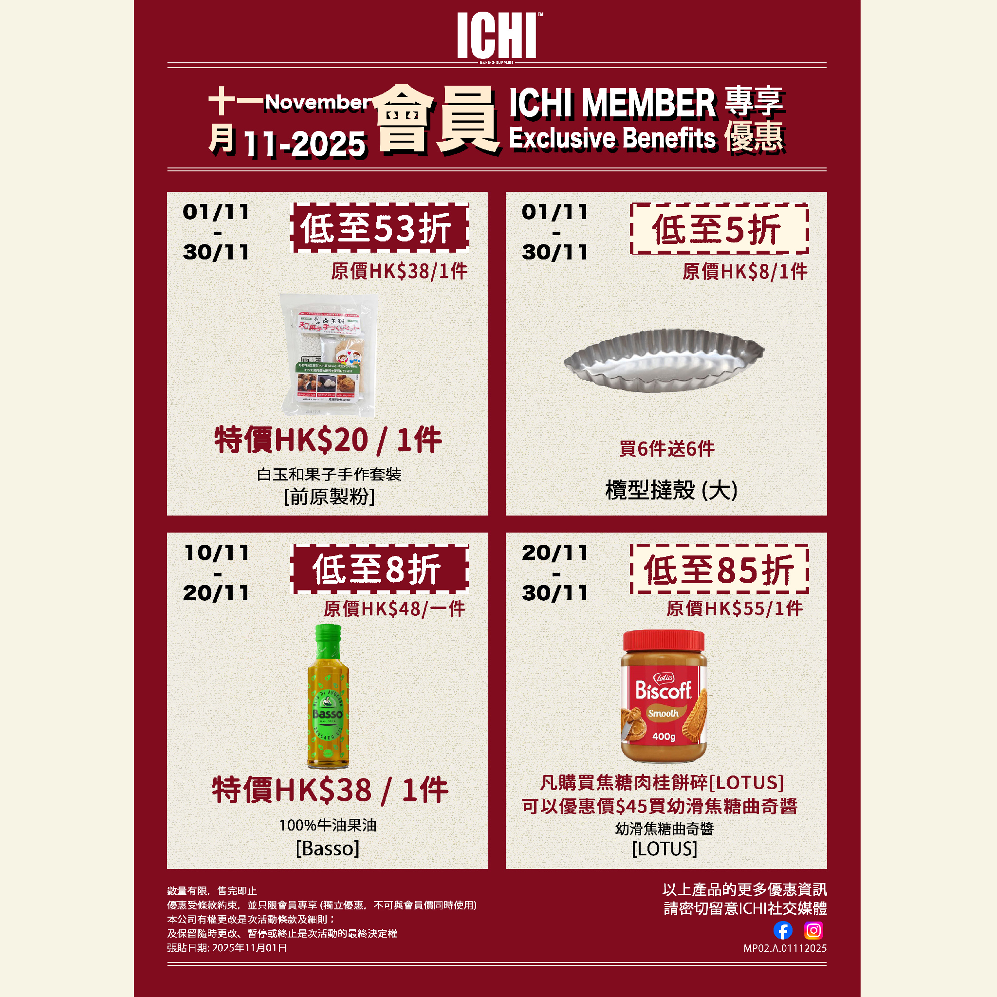 其實無論於我們烘焙網店作烘焙網購,又或直接到我們實體烘焙專門店選購各類烘焙用品等,不論是本烘焙店的會員或非會員,都歡迎大家於我們實體店或網店作baking產品選購。但如成為ICHI烘焙專門店,可有不少優惠,例如每次選購可獲取積分,儲有相當積分可換購指定烘焙產品;而每次作烘焙產品惠顧,都可享有折扣優惠(只限烘焙店門市會員,烘焙網店會員則不設折扣優惠,而作烘焙網購所得會員積分,是不能跟烘焙店的門市單據合併計算)。